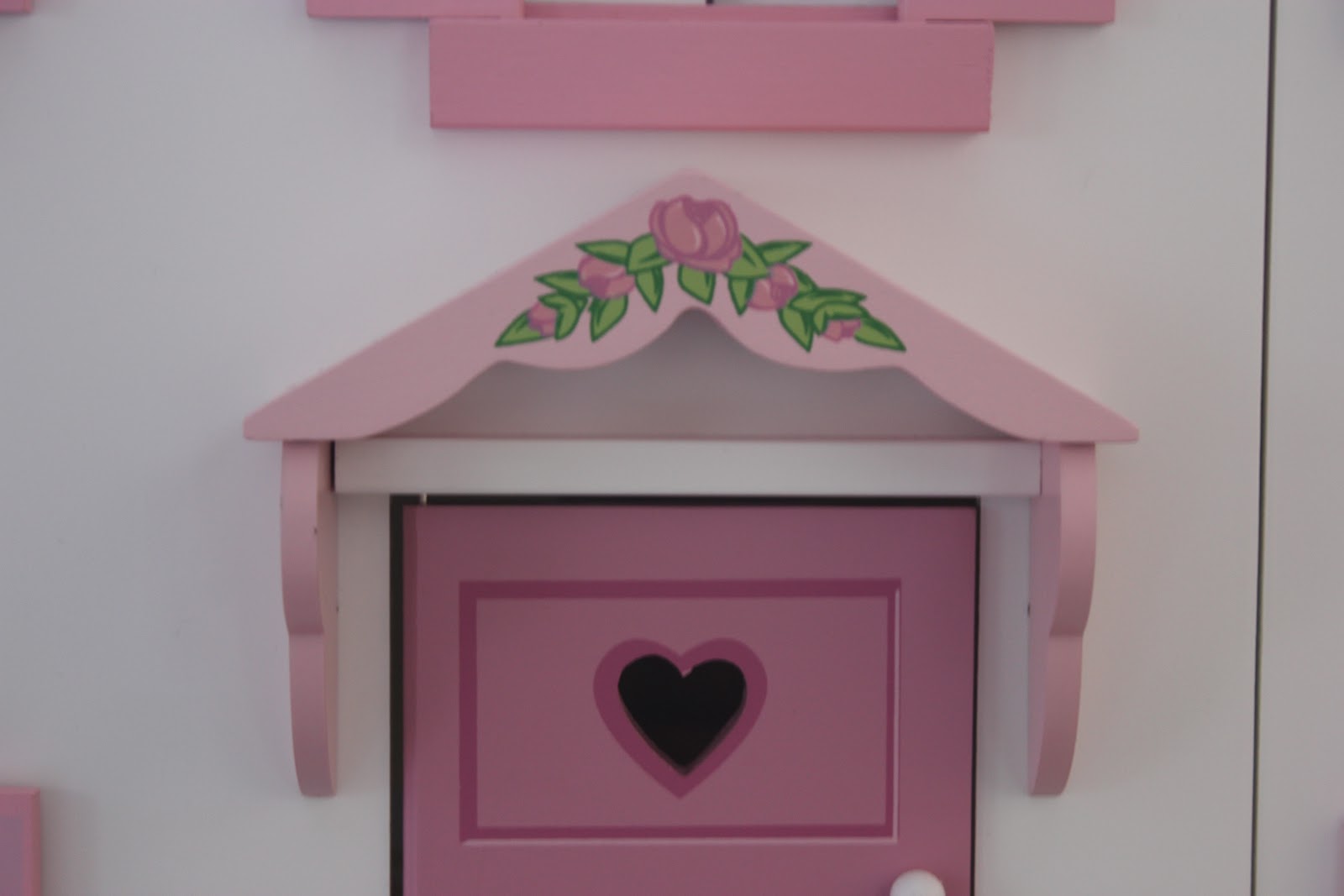 As you can see she was thrilled with her present. Construction was so simple a trained monkey wearing a blindfold could do it. I only used a screwdriver once, to screw on the porch above the front door. The rest of it just slotted it together and held in place by the side window boxes. Simple.