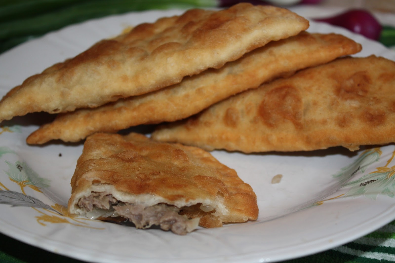 Take the balls of dough one by one and using the rolling pin make them very thin. It needs to be like a circle. Take one spoon of the meat mixture and add it on one dise of the circle. Cover the side with the meat with the empty side to form semicircle(half moon basically).